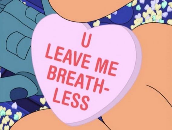 В серии “Любовь и ракета” команда Planet Express получает задание в День святого Валентина доставить партию сладких сердечек на другую планету. Однако местные правители отвергают подарок: отчасти из-за отвратительного вкуса, но в основном потому, что человеческая концепция любви им чужда. Инопланетяне настолько злы, что преследуют Planet Express через всю Галактику. Ситуация ухудшается, когда Бендер решает порвать с искусственным интеллектом корабля. Компьютер, обиженная Бендером, пытается покончить с собой и отключает систему снабжения кислородом. Лила может это исправить, но в ее баллоне остается слишком мало воздуха. Ничего не говоря, Фрай отдает любимой весь воздух и умирает, глядя на милые послания на сладких сердечках в надежде найти самое подходящее, чтобы описать свои чувства. Когда Лила реанимирует героя, Фрай выплевывает конфетку с надписью: «С тобой я забываю, как дышать».