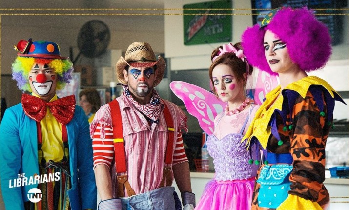 С какими только злодеями не приходилось сталкиваться главным героям сериала «Библиотекари», но в одном из эпизодов грядущего третьего сезона они встретят такого антагониста, какого шоу еще не видело, и произойдет это прямо в гастролирующем парке аттракционов. Судя по фотокадру, появившемуся в Сети, маскироваться центральные персонажи приключенческого фэнтези умеют — их четверка очень убедительно смотрится в костюмах клоунов.