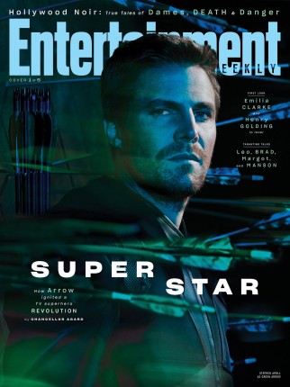 Потенциально опасная идея пришла команде EW и для промо Зеленой Стрелы. С другой стороны, за восемь лет Стивен Амелл уже сотни раз позировал с луком и стрелами и, должно быть, утомился от этого. Потому для него нужно было придумать что-то новенькое, сложное и бросающее вызов. Карлосу вспомнилась знаменитая обложка Esquire, на которой великий Мухаммед Али стоит со связанными за спиной руками, а из его тела торчат несколько стрел. «Но мы не хотели аналогичным образом застрелить Оливера Куина, ведь он все-таки супергерой, — комментирует художественное решение Серрао. — Вместо этого Уорд вонзил множество стрел по силуэту Стивена в стену за его спиной». Таким образом фотограф и его команда подчеркнули неуязвимость полюбившегося зрителям персонажа.