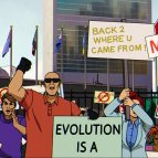 Плакаты: Долой мутантов, Вернитесь откуда пришли, Остановите мутантов, слово «Мутанты» со знаком запрета, флаг и инициалы «Друзей человечества», а также «Эволюция…» (дальше не видно). Также был крик «Выходите сюда, трусы»